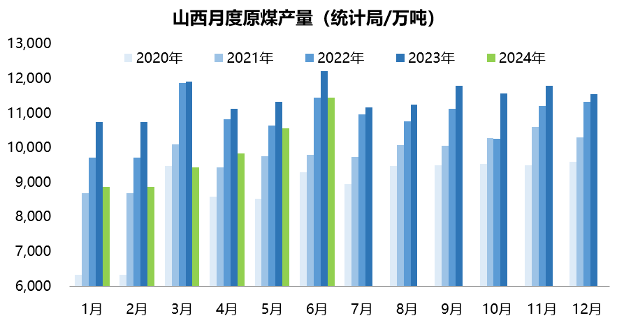 1.2、2024年6月山西原煤产量11456万吨,环比增长8.42%,同比减少6.5%,降幅较上月缩窄0.4个百分点,同比降幅连续三个月缩窄;2024年1-6月山西累计原煤产量为58788.7万吨,同比减少13.5%或9050万吨。若想实现年度13亿吨的产量目标,累计同比降幅仍需进一步收窄至4%左右方可有望达成。从目前来看,这一产量目标达成仍然压力较大。