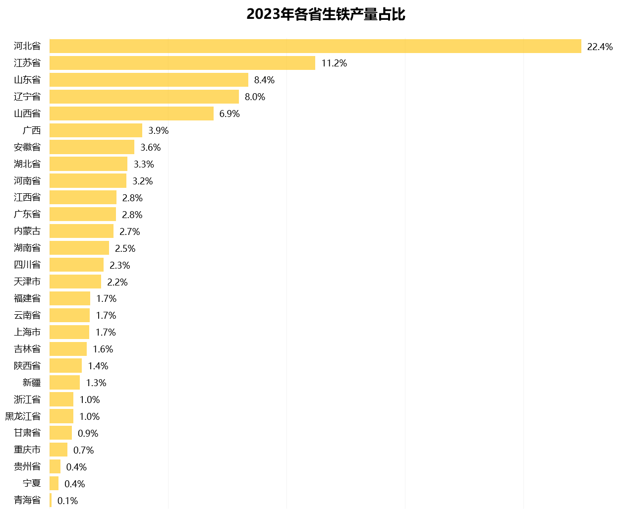 其余十五个省份年生铁产量均在2000万吨以下。其他省份的生铁产量占比从高到低依次为:四川省2.3%,天津市2.2%,福建省1.7%,云南省1.7%,上海市1.7%,吉林省1.6%,陕西省1.4%,新疆1.3%,浙江省1.0%,黑龙江省1.0%,甘肃省0.9%,重庆市0.7%,贵州省0.4%,宁夏0.4%,青海省0.1%。