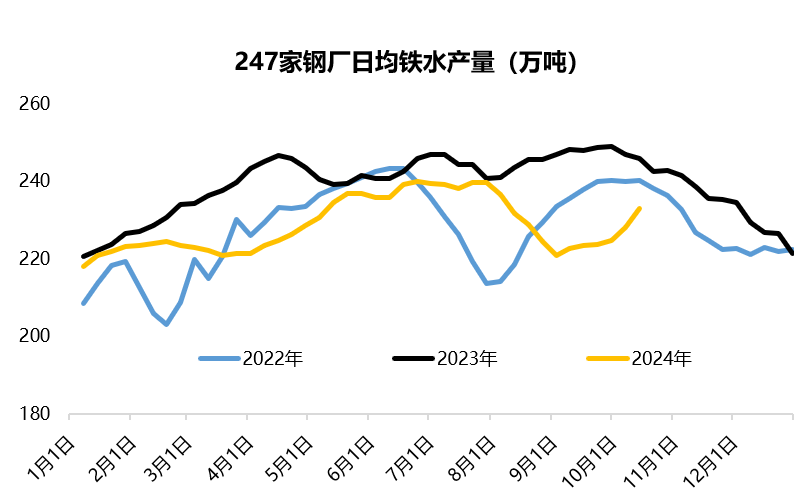 四、终端需求:截至10月11日,当周247家钢厂日均铁水产量为233.08万吨,环比上周增加5.06万吨。