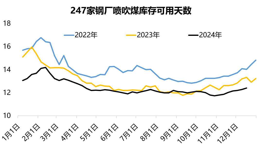 2、截至12月13日,当周247家钢厂喷吹煤库存为407.91万吨,环比增加5.87万吨;喷吹煤库存可用天数为12.41天,环比增加0.13天。