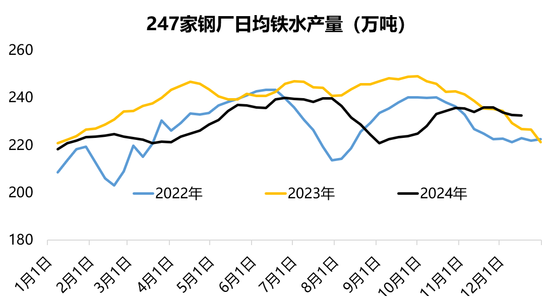 四、终端需求:截至12月13日,全国247家钢厂日均铁水产量为232.47万吨,环比减少0.14万吨。