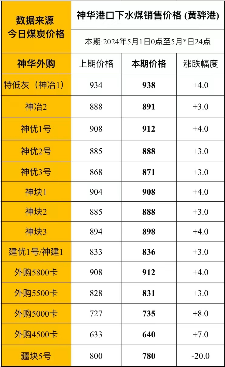 4月30日,神华黄骅港外购下水煤销售价上涨3-8元/吨