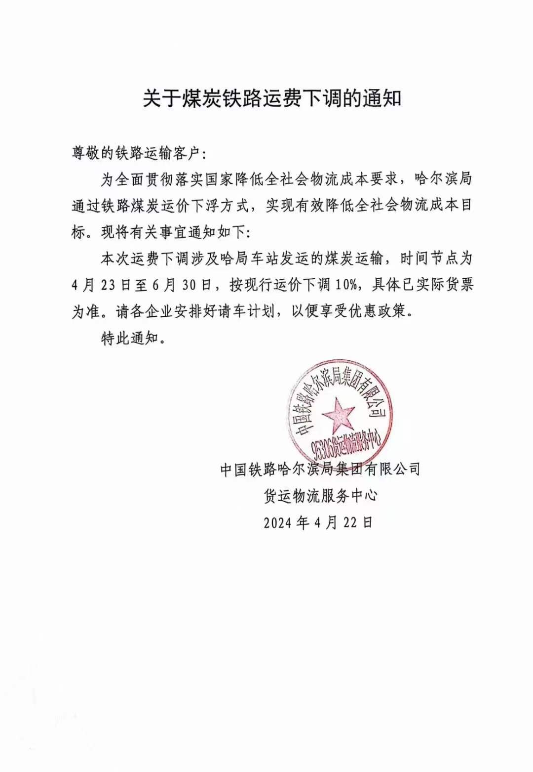 中国铁路哈尔滨局集团有限公司货运物流服务中心:本次运费下调涉及哈局车站发运的煤炭运输,时间节点为4月23日至6月30日,按现行运价下调10%