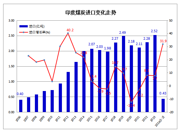 2024年1-2月印度煤与煤焦进口同比增长31.9%
