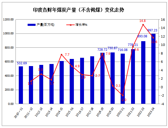 2023-24财年印度煤炭产量同比增长11%,首度突破10亿吨