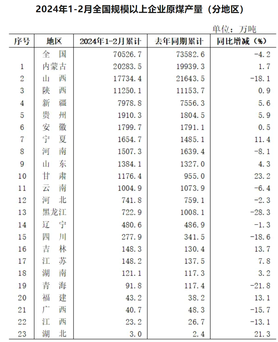 2024年1-2月全国分省区原煤产量排名公布